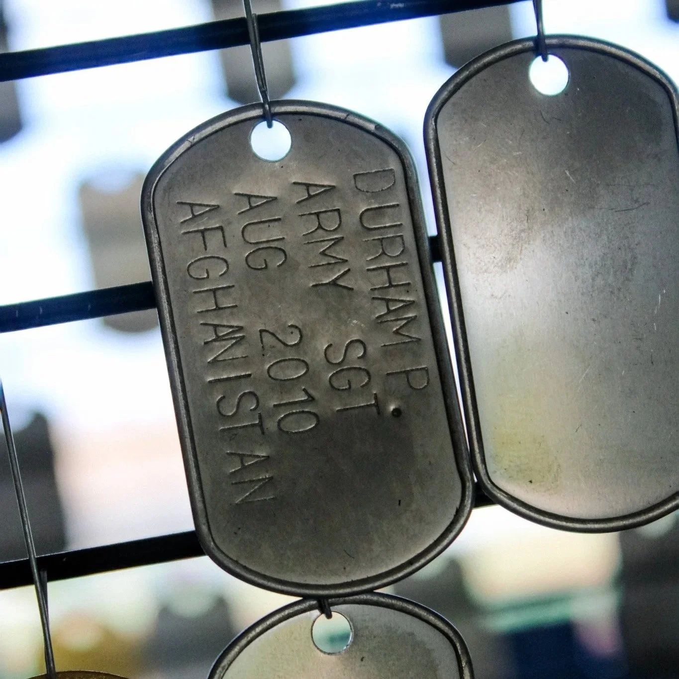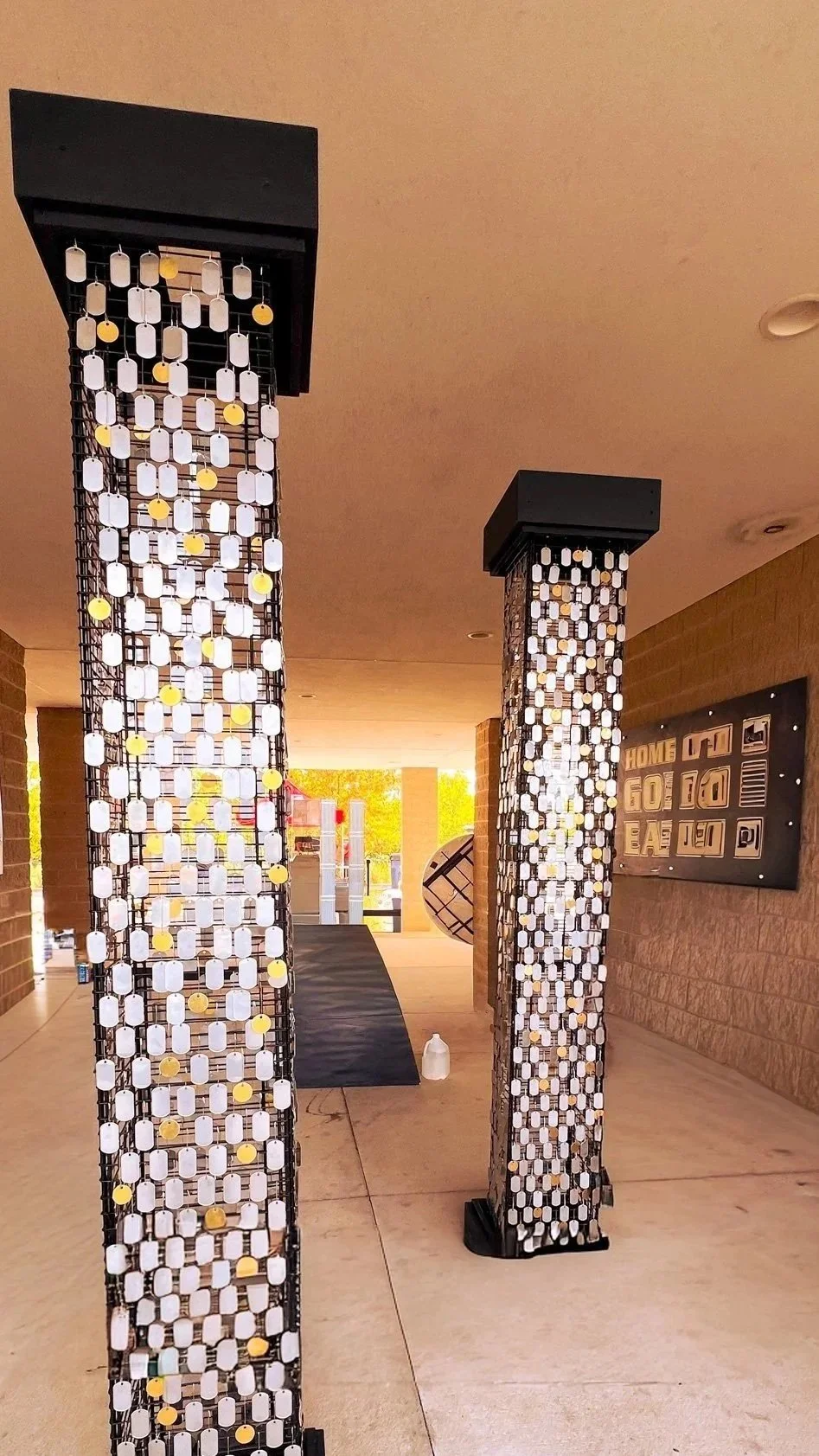The monument is a hand crafted exhibit by a Hero Services Representative and each Dog Tag/ Accountability Tag is individually stamped. Currently the towers stand 8 feet tall and can only showcase half of the tags needed to honor all of the casualties. The intention is to expand the monument to 14 feet tall and widen the sides of the towers in order to hold all of the tags of the nearly 7,500 casualties of our services men and women during the response to ground zero, and the wars that followed.
